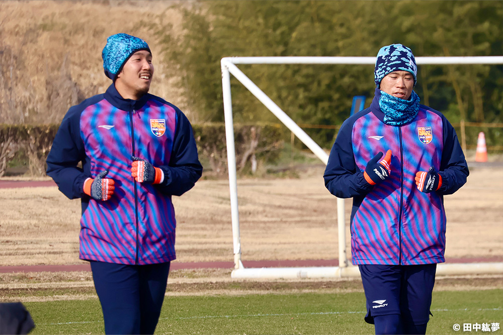 練習後恒例の20分ジョグ。昨季ゲームキャプテンの大野佑哉と肩をそろえたのは、カマタマーレ讃岐から加わった長谷川隼だ。大野は阪南大学時代のチームメイトで、1歳上の先輩だが、「佑哉」と呼び捨てにするほど親睦が深い。